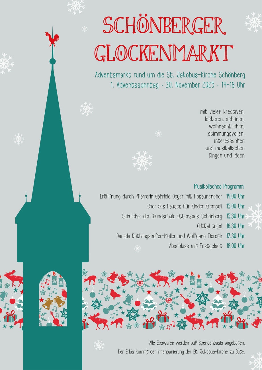 Am Sonntag darauf wird dann der Glockenmarkt um 14 Uhr von dem Ev. Posaunenchor und Pfarrerin Gabriele Geyer eröffnet. In den weihnachtlich geschmückten Buden warten glitzernder Weihnachtsschmuck, originelle, handgefertigte Geschenkideen, duftende hausgemachte Weihnachtsplätzchen, gebrannte Mandeln, Kuchen und Stollen und andere Leckereien auf die Besucher. Verschiedene Chöre der Kirchengemeinde wie der Ev. Posaunenchor, die Kinder des Hauses für Kinder Krempoli, der Schulchor Ottensoos-Schönberg und der CHORal total sorgen mit ihren Liedern und Melodien für weihnachtliche Stimmung. Auch für das leibliche Wohl ist mit fränkischen Spezialitäten, Waffeln, Hefespatzen, Glühwein und Kinderpunsch bestens gesorgt. In der Jakobuskirche warten auf die Besucher verschiedene, handwerklich gefertigte Weihnachtskrippen des diesjährigen Krippenbaukurses zum Bestaunen. Für die Kinder gibt es Bastelangebote im Gemeindehaus und alle Jahre wieder eine Tombola. Die Schönberger Vereine und zahlreiche Ehrenamtliche der Kirchengemeinde und darüber hinaus haben mit viel Liebe und Mühe ihre Fähigkeiten bereitgestellt, um zum Gelingen des Marktes beizutragen. Der Erlös soll der Innensanierung der Schönberger St. Jakobuskirche zu Gute kommen. Mit vollem Glockengeläut um 18 Uhr wird der Markt beendet.