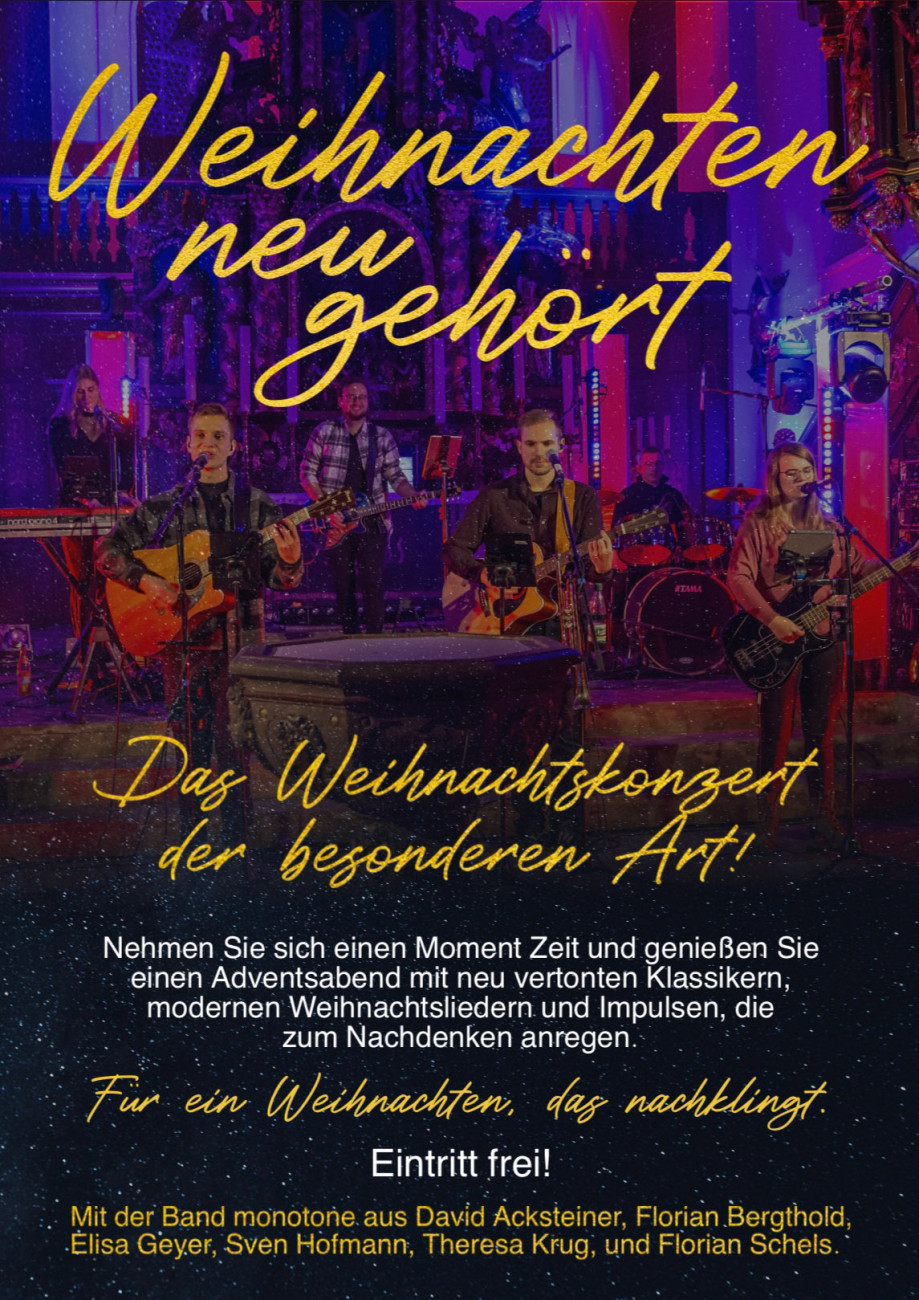 Als Auftakt zum 8. Schönberger Glockenmarkt am 1. Advent gibt es bereits am Vorabend, Samstag, 29.11. um 18.30 Uhr ein besonderes Weihnachtskonzert unter dem Motto: „Weihnachten neu gehört – Musik, die die Herzen berührt“. Ein Musikprojekt der Jugendband „Monotone“ das moderne Weihnachtslieder mit neu arrangierten, klassischen Weihnachtschorälen verbindet und so ein einzigartiges Hörerlebnis schafft. Der Eintritt ist frei.